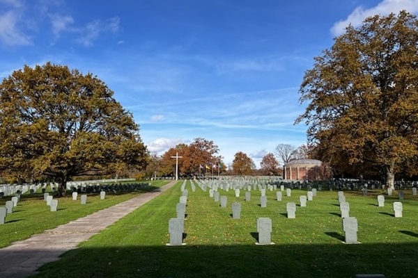Los ging es nicht zufälligerweise an einem geschichtsträchtigen Datum – dem 11.11., also an dem Tag, an dem die deutsche Armee vor 107 Jahren den Waffenstillstand mit Frankreich schließen musste und der den 1. Weltkrieg beendete. Jahr für Jahr begeht man ihn im Nachbarland als Nationalfeiertag, um der Kriegsgefallenen zu gedenken. Um dies einmal zu erleben, besuchte die Schülerinnen und Schüler in Niederbronn im Elsass solch eine Gedenkveranstaltung. Davon ließ sich dann recht leicht ein Bogen schlagen zu der nachmittaglichen Führung über die Kriegsgräberstätte neben der Jugendherberge. In drei Gruppen führten drei Guides über das Gelände mit mehreren tausend Gräbern vornehmlich deutscher Wehrmachtssoldaten. Dabei brachten sie den Schülerinnen und Schülern die Biografien und Schicksale der dort Begrabenen näher.