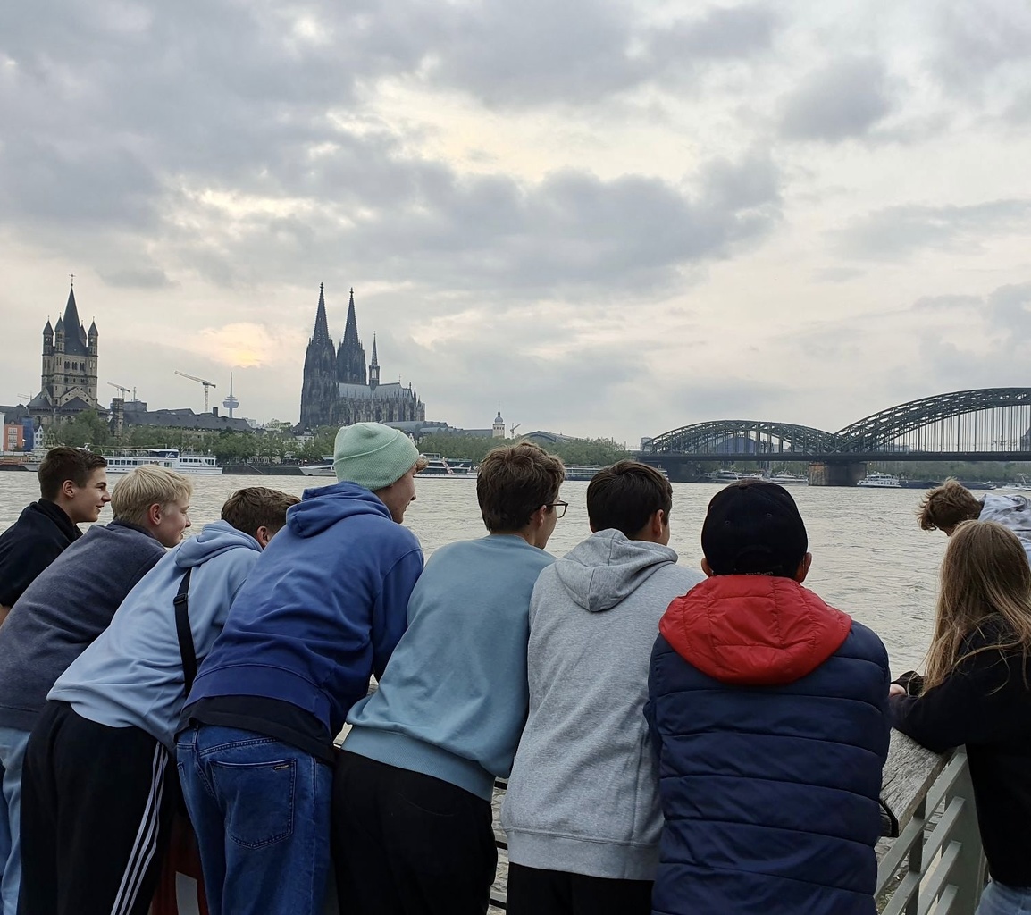 Am nächsten Morgen ging es dann hoch hinaus: Bei schönstem Frühlingswetter wurde der Kölner Dom erklommen und der Aufstieg über 533 Stufen mit einem tollen Blick über die Stadt belohnt. Nachdem bei der anschließenden Domführung das Wahrzeichen der Stadt mit seiner beeindruckenden Historie näher unter die Lupe genommen worden war, durfte die Lateinklasse im Deutschen Sport & Olympia Museum nicht nur Interessantes zur Sportgeschichte von der Antike bis zur Gegenwart erfahren, sondern getreu dem diesjährigen Schulthema „Gesundheit und Bewegung“ auch selbst auf vielfältige Weise sportlich aktiv werden. So erprobten die Schüler*innen zum Beispiel den antiken Weitsprung mit Gewichten und stiegen – unter großem Jubel und anfeuernden Rufen ihrer Mitschüler – in den Boxring. Um das dabei erlangte Kaloriendefizit schnell wieder auszugleichen, ging es anschließend auf einen Sprung ins benachbarte Schokoladenmuseum direkt am Rheinufer, wo selbstverständlich auch eine kleine, süße Kostprobe inklusive war.